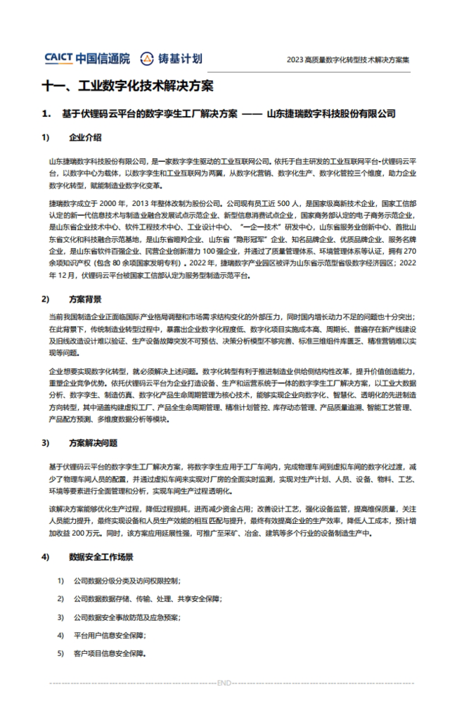 近日,中國信息通信研究院“鑄基計(jì)劃”《2023高質(zhì)量數(shù)字化轉(zhuǎn)型技術(shù)解決方案集(第一版)》(以下簡稱“《方案集》”)正式發(fā)布,遴選出一批具有產(chǎn)業(yè)推廣應(yīng)用效應(yīng)的企業(yè)數(shù)字化轉(zhuǎn)型技術(shù)方案,旨在推動數(shù)字經(jīng)濟(jì)時(shí)代社會生產(chǎn)方式、生活方式及治理方式變革。由捷瑞數(shù)字打造的《基于伏鋰碼云平臺的數(shù)字孿生工廠解決方案》成功入選,為加快企業(yè)數(shù)字化轉(zhuǎn)型進(jìn)程提供了強(qiáng)有力的支持。