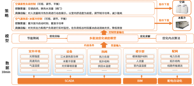 ▲以新能源數(shù)字孿生一體化管控平臺(tái)(光伏-熱泵-水冷機(jī)組-冰蓄冷聯(lián)供系統(tǒng))為例的優(yōu)化策略控制
