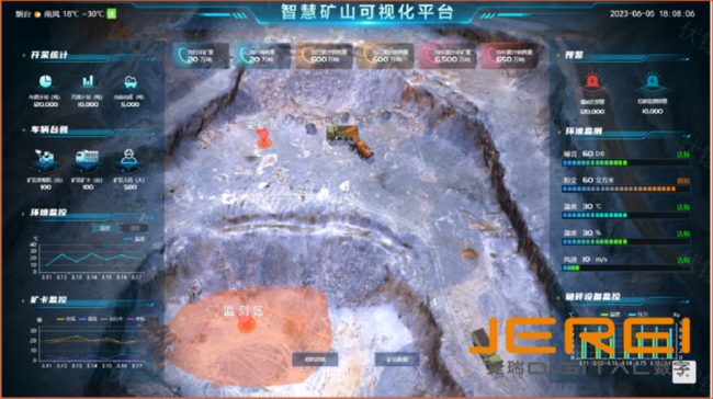 智慧礦山系統面向生產現場管理,以數字孿生為驅動,對礦山環(huán)境、地形、設備、人員、路網等各要素態(tài)勢進行數字映射,還原生產現場。同時,系統還可結合前端智能感知設備數據,集成現有系統數據,實現對礦山生產、設備、人員、運輸、環(huán)境、能耗等生產現場全要素的綜合監(jiān)控,對異常事件進行實時報警,實現一圖覽全“礦”的效果,從而提升管理效率,降低安全風險。