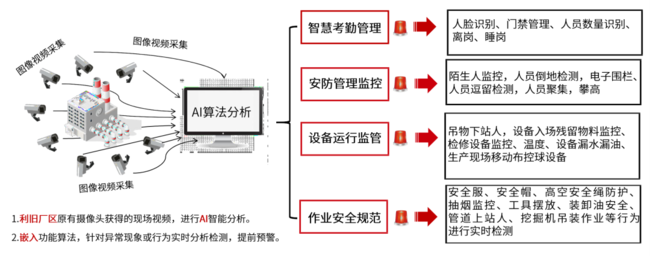 安全管控中心依托AI視覺分析技術,對安全生產管理進行違規(guī)操作監(jiān)測和智能預警。中心涵蓋了多種應用,利舊廠區(qū)原有攝像頭,涉及智慧考勤、安防管理監(jiān)控、設備運行監(jiān)管、作業(yè)安全規(guī)范四大類別。