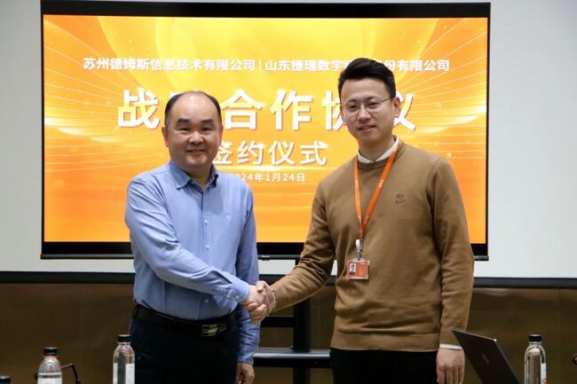 2024年1月24日,山東捷瑞數(shù)字科技股份有限公司(以下簡(jiǎn)稱“捷瑞數(shù)字”)與蘇州德姆斯信息技術(shù)有限公司(以下簡(jiǎn)稱“德姆斯”)簽署戰(zhàn)略合作協(xié)議,雙方將在數(shù)字化轉(zhuǎn)型領(lǐng)域開(kāi)展深入合作,共同探索工業(yè)自動(dòng)化領(lǐng)域數(shù)字化轉(zhuǎn)型與企業(yè)變革。德姆斯董事長(zhǎng)包繼華、捷瑞數(shù)字研發(fā)中心總經(jīng)理?xiàng)畋蟠黼p方在協(xié)議書(shū)上簽字。